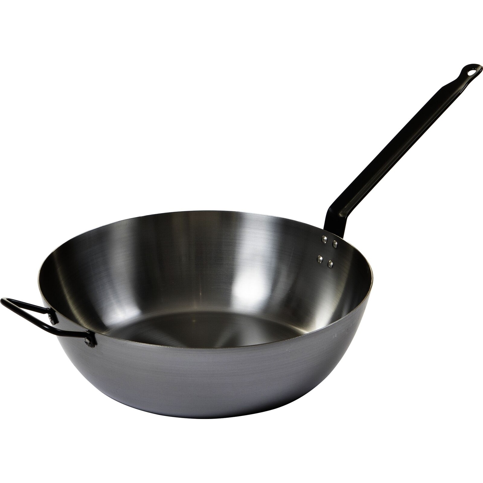 Eisen. Materialstärke 2mm. Für alle Herdarten geeignet, auch Induktion. Pflegehinweise beachten. Nicht spülmaschinengeeignet.