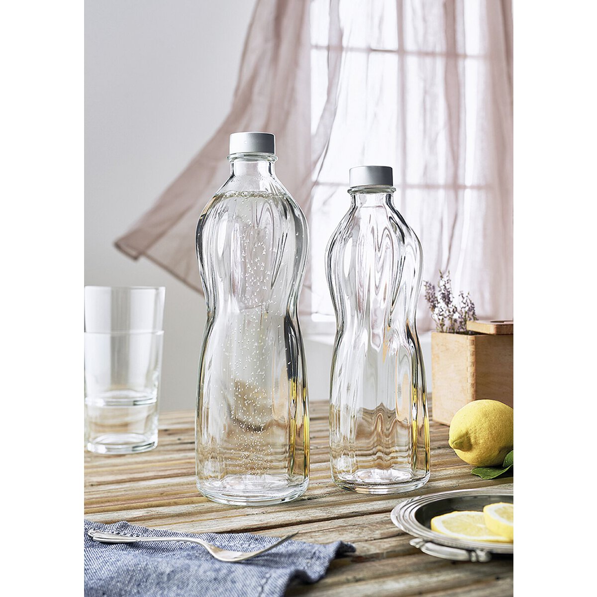 Glas. Mit Metallschraubverschluss. Für kohlensäurehaltige Getränke geeignet. Spülmaschinengeeignet. Metallverschluss bitte per Hand spülen. Perfekt für das Servieren von Mineralwasser am Tisch.