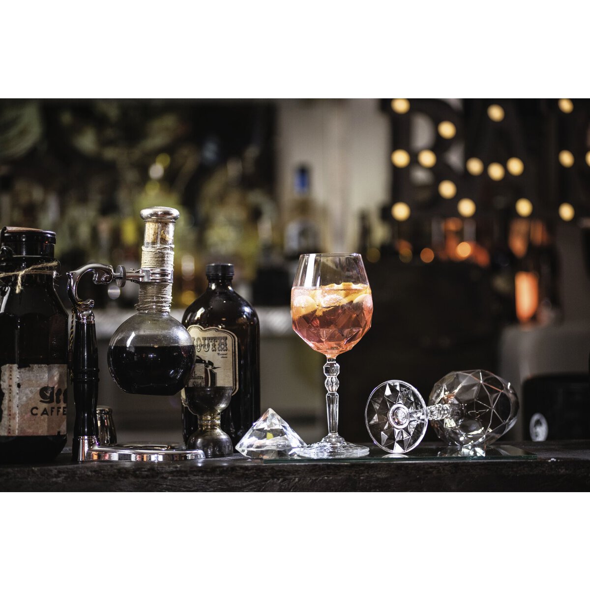 Eine Serie in außergewöhnlichem Design, die sowohl für die Tischeindeckung als auch für Bars geeignet ist. Die Form erinnert an geschliffene Diamanten und verleiht Aperitifs und Cocktails eine edle, exklusive Note.