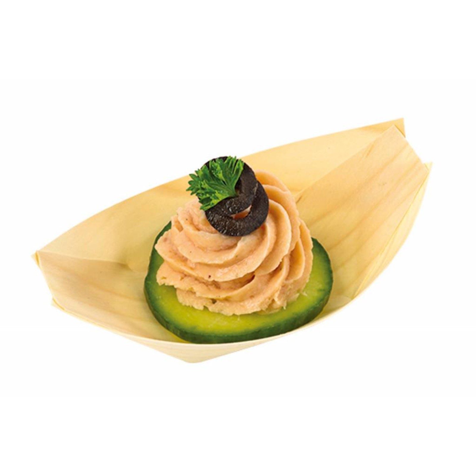 Pinienholz. Kompostierbar, temperaturbeständig: 80° C. Nicht geeignet für Backofen, Mikrowelle und Tiefkühlung. Im 100er Pack.
