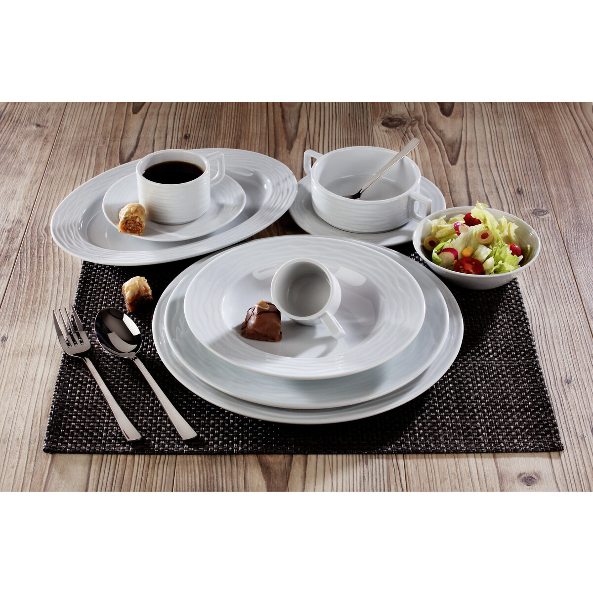 Weißes Hotelporzellan mit dekorativer Reliefstruktur. Mischsortierung. Spülmaschinengeeignet.