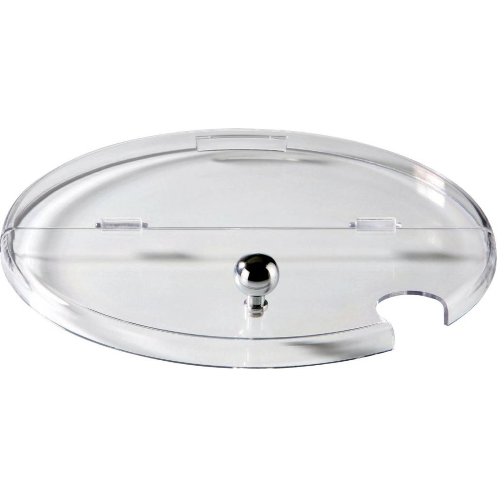 Acryl, klar aufklappbar mit Edelstahlknopf und Löffelaussparung.