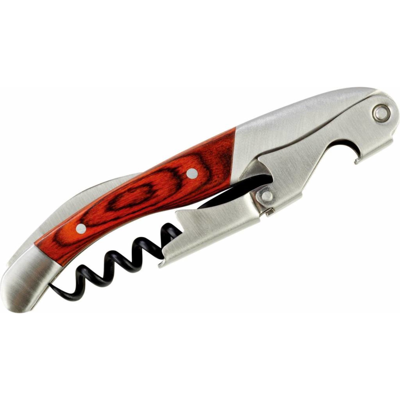 Edelstahl/ Holz, mit edlem Holzgriff, inkl. Flaschenöffner, Korkenzieher und Messer mit Sägeblatt.