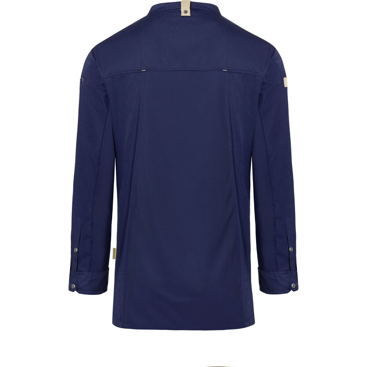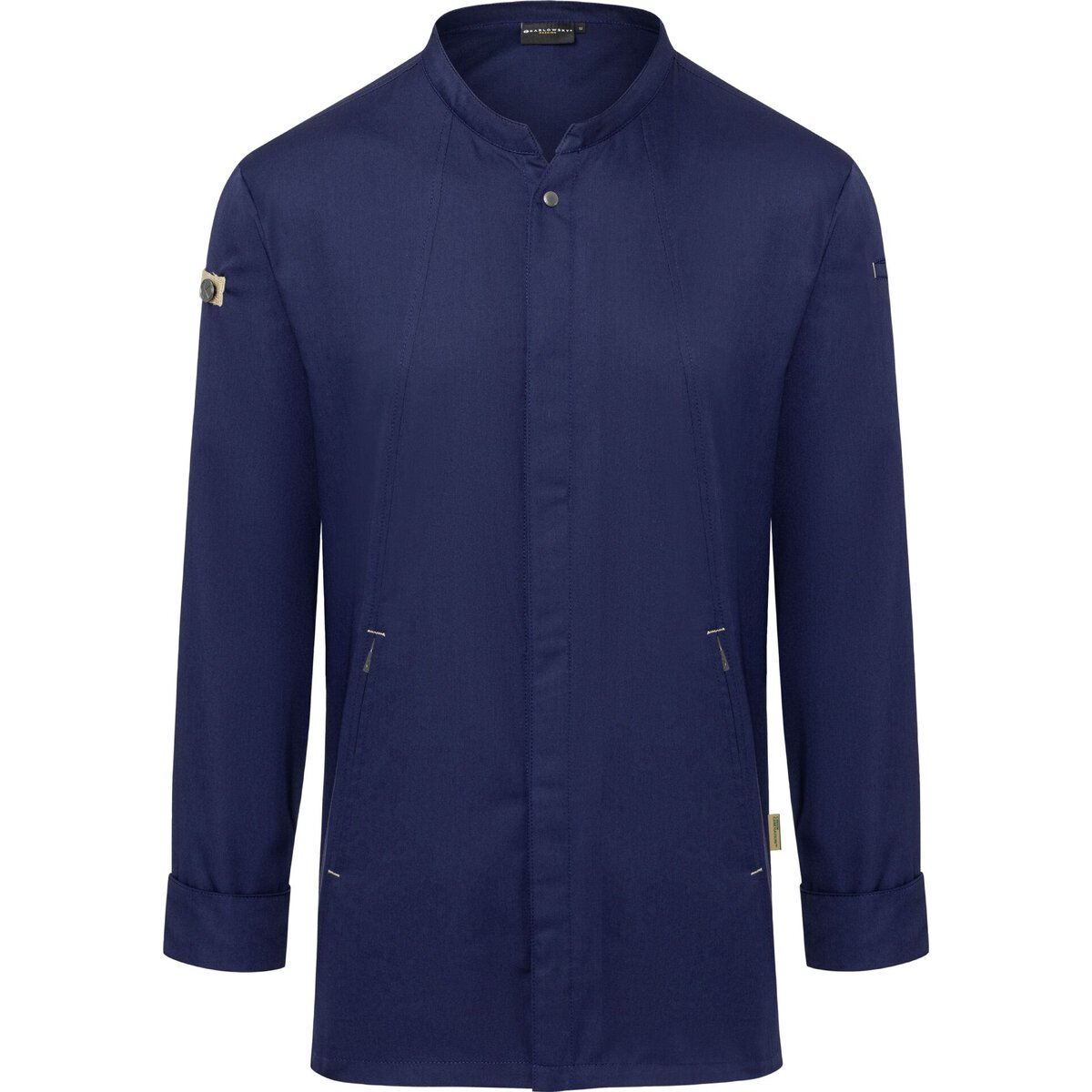Farbe: stahlblau. Vorderteil 65 % Polyester (recycelt), 35 % Baumwolle, Rückseite 100 % Polyester. Innovative nachhaltige Kochjacke, die urbanen Style mit natürlichem Flair verbindet. Polyesteranteil aus recyceltem Plastik, leicht tailliert geschnitten, Rückeneinsatz aus Jersey Pique sorgt für angenehme Belüftung und erhöhte Bewegungsfreiheit, mit Druckknöpfen zum schnellen Öffnen und Schließen, Ärmelmanschetten mit Druckknöpfen, Vorderteil mit Reißverschlusstaschen und Leistentasche am linken Ärmel, stylische Applikationen aus Kontrastbändern an den Ärmeln und im Nacken für eine urbane Optik.