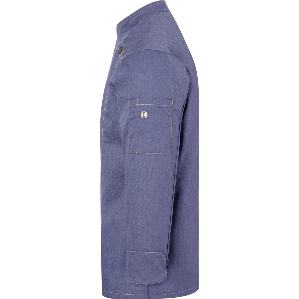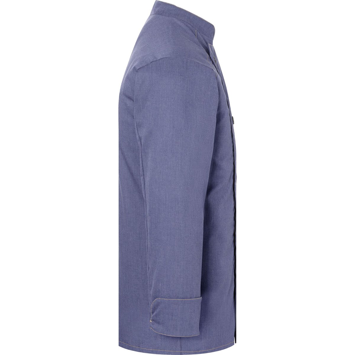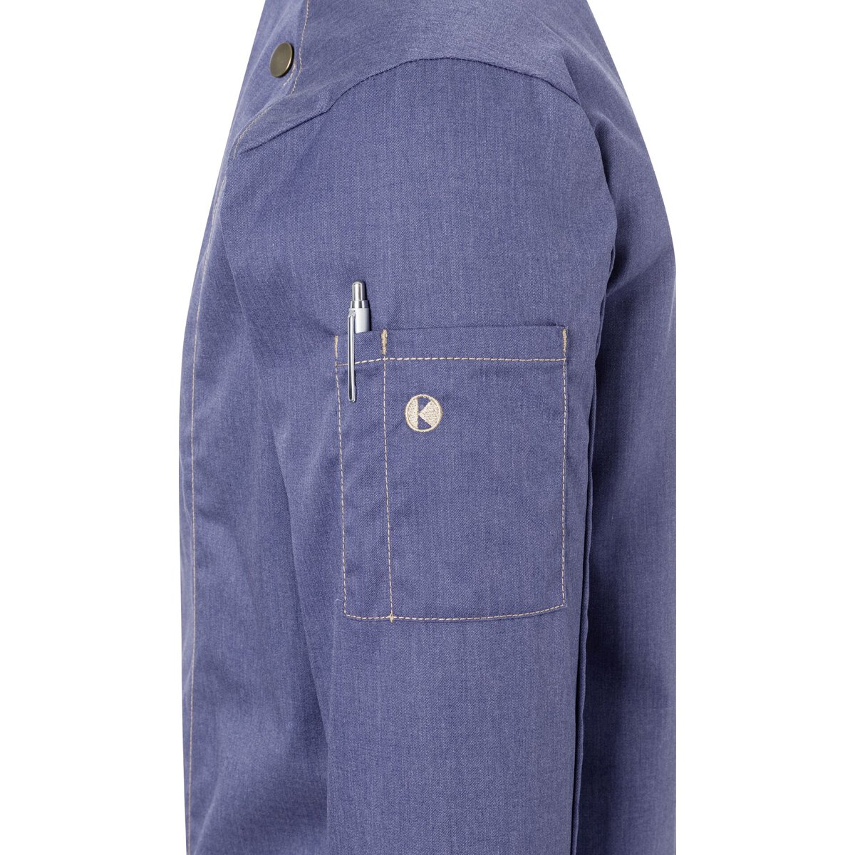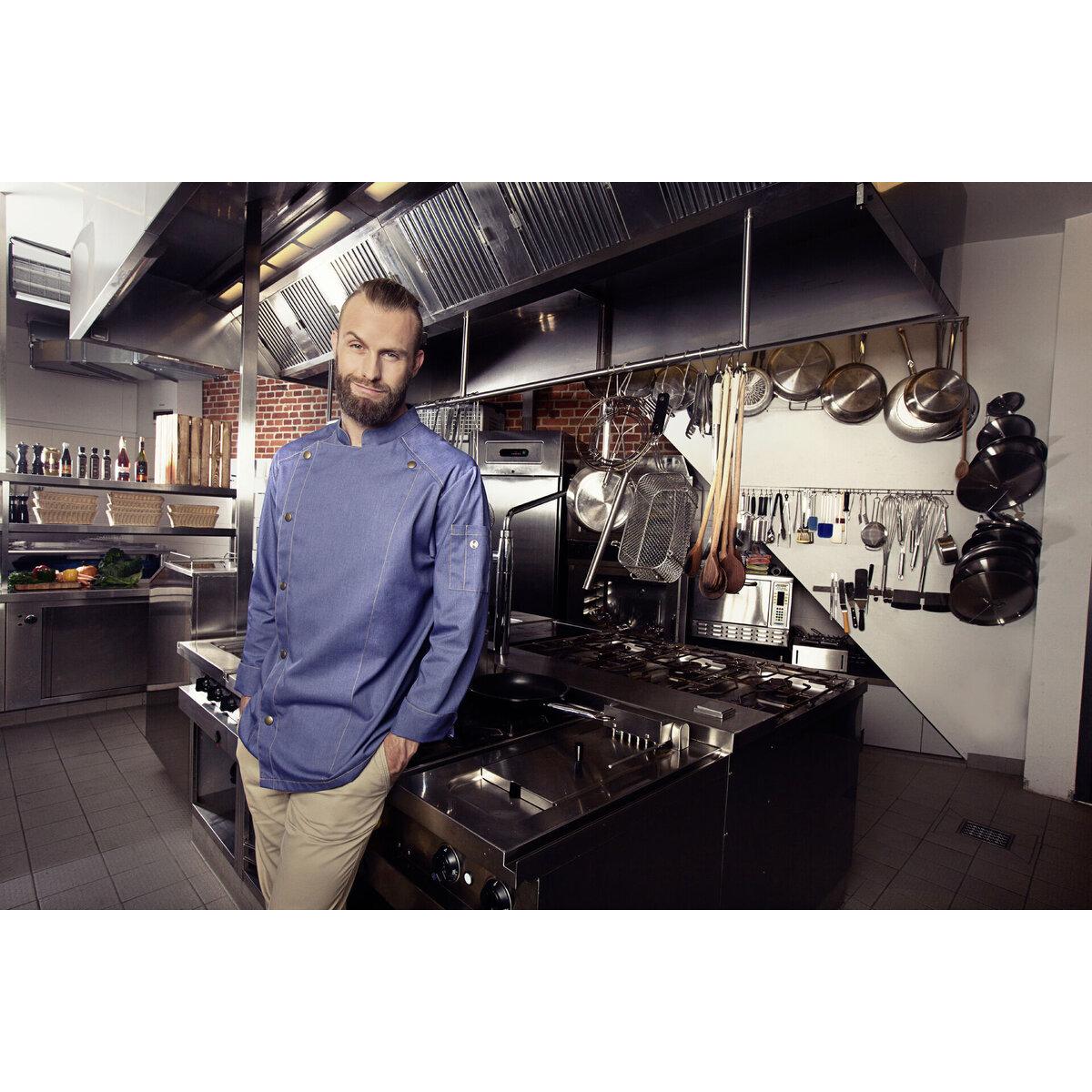 Farbe: Vintage blue. Trendige Kochjacke in Jeans-Optik mit schlanker Silhouette. Kontrastfarbige Steppnähte für den originalen Jeans-Look. Asymmetrisch geschlossene, einreihige 5-Knopf-Jacke mit Druckknöpfen zum schnellen Öffnen und Schließen. Ärmelmanschetten mit Schlitz. Aufgesetzte Ärmeltasche links mit praktischem Stiftfach. Industriewäschetauglich (95°C). 65% Polyester/ 35% Baumwolle. Köpergewebe, 195 g/m². Hochveredelt, gekrumpft, waschecht, pflegeleicht.