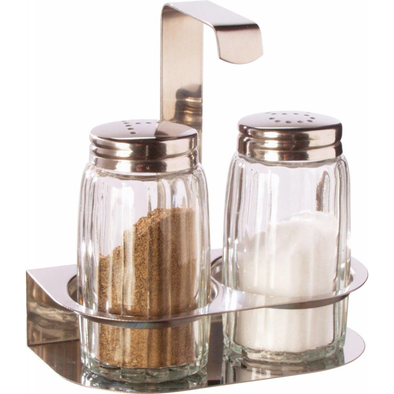 Glasbehälter mit Edelstahlkappe 18/0. Set bestehend aus Salz-, Pfefferstreuer und Menagengestell.