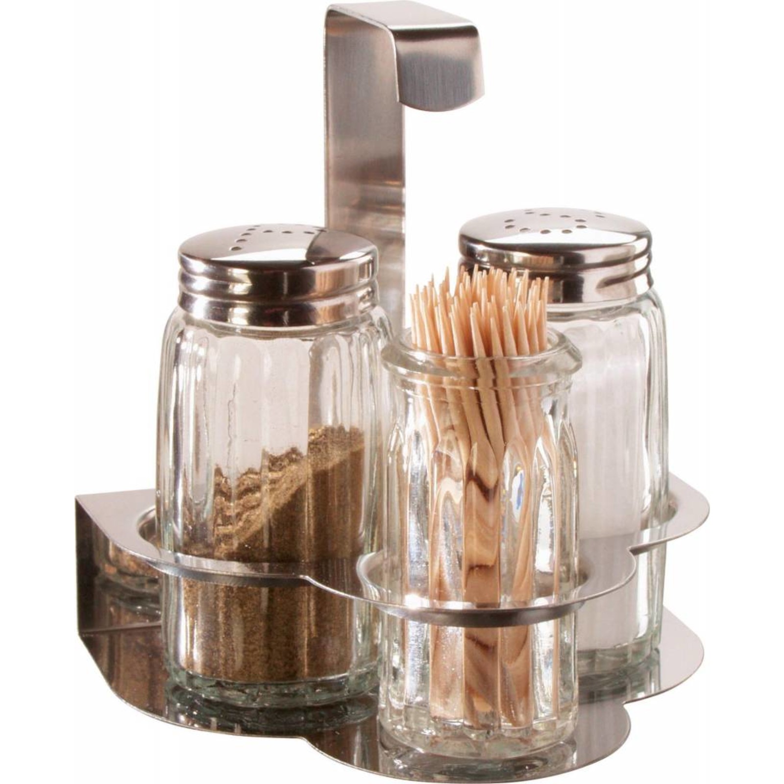 Glasbehälter mit Edelstahlkappe 18/0. Set bestehend aus Salz-, Pfefferstreuer, Zahnstocherglas und Menagengestell.