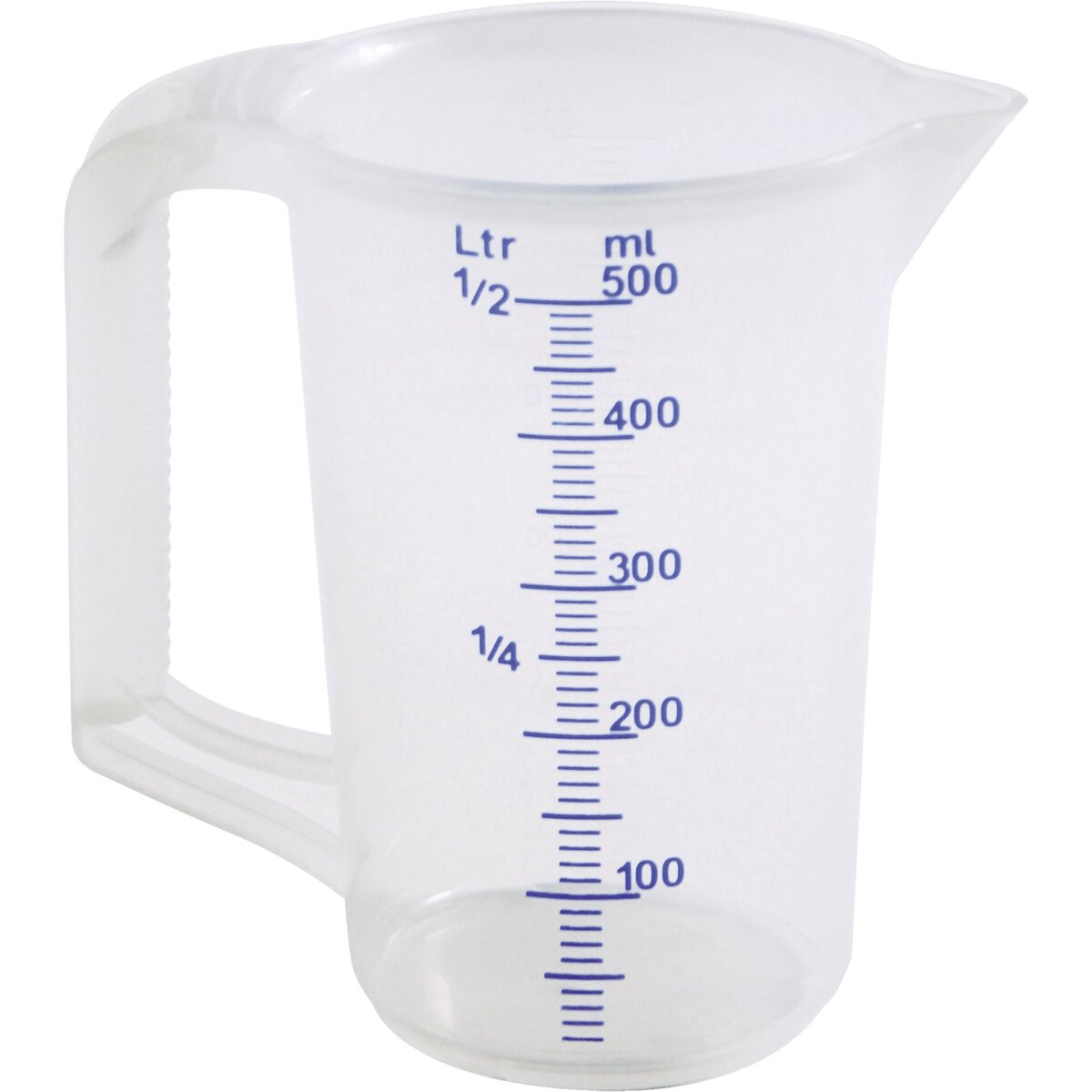 Kunststoff PP, transparent, geprägte Skala und blauer Skaladruck, Liter- und Millilitereinteilung.