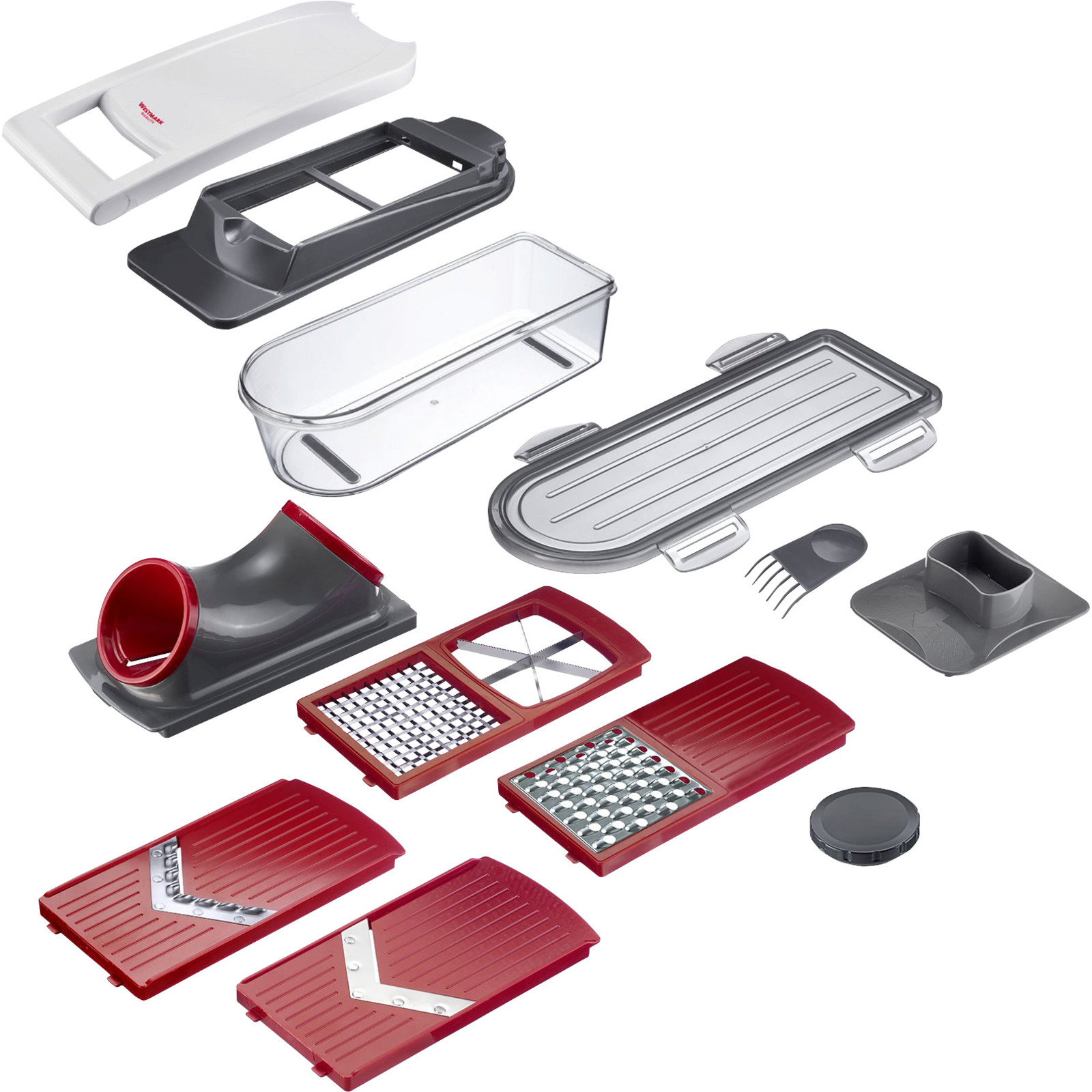 Material: ABS, PP, PS, Edelstahl, 12-teiliger Schneider zum vielseitigen Zubereiten von Gemüse oder Obst, mit einer Schneideinheit für Würfel und 6 gleiche Stücke, einem Einsatz zum Reiben von Käse, Früchten und Gemüse, einem Einsatz mit Buntschneider für sauberen und ausgeprägtem Wellenschnitt, einem Hobel für dünne Scheiben, einem Julienne- u. Spiralschneider, einem Auffangbehälter mit Frischhaltedeckel und Gummifüßchen, zwei Restehaltern für die sichere Zubereitung und einem Reinigungskämmchen. Spülmaschinengeeignet.