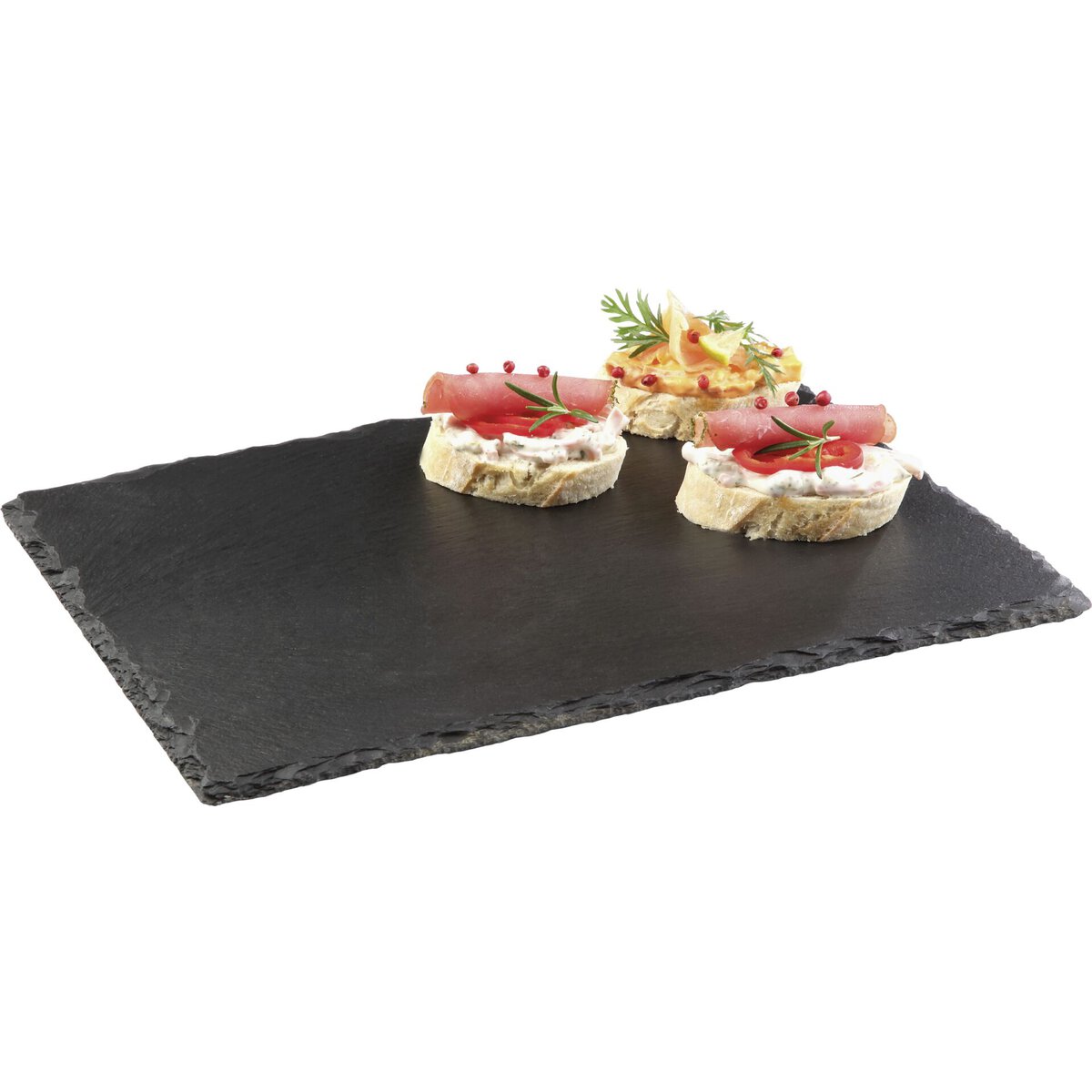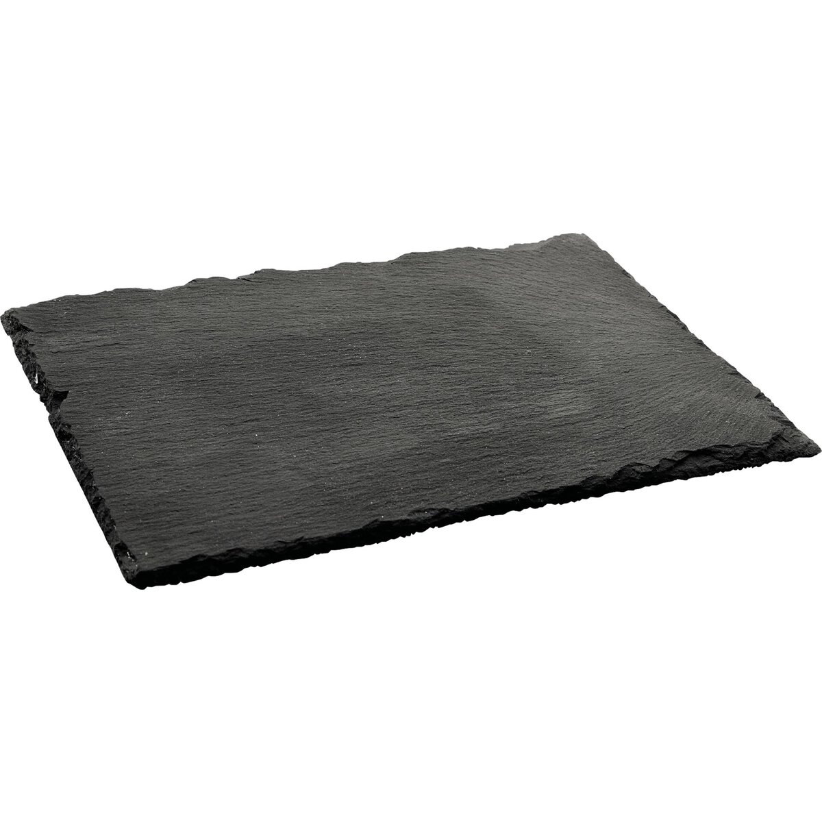 Naturschiefer. Mit Antirutsch-Füßchen. Versiegelt mit lebensmittelechtem Speziallack. Fett- und wasserdichte Oberfläche. Gebrochene Kante. Hervorragende Kältespeicherung durch Naturschiefer. Nicht spülmaschinengeeignet!