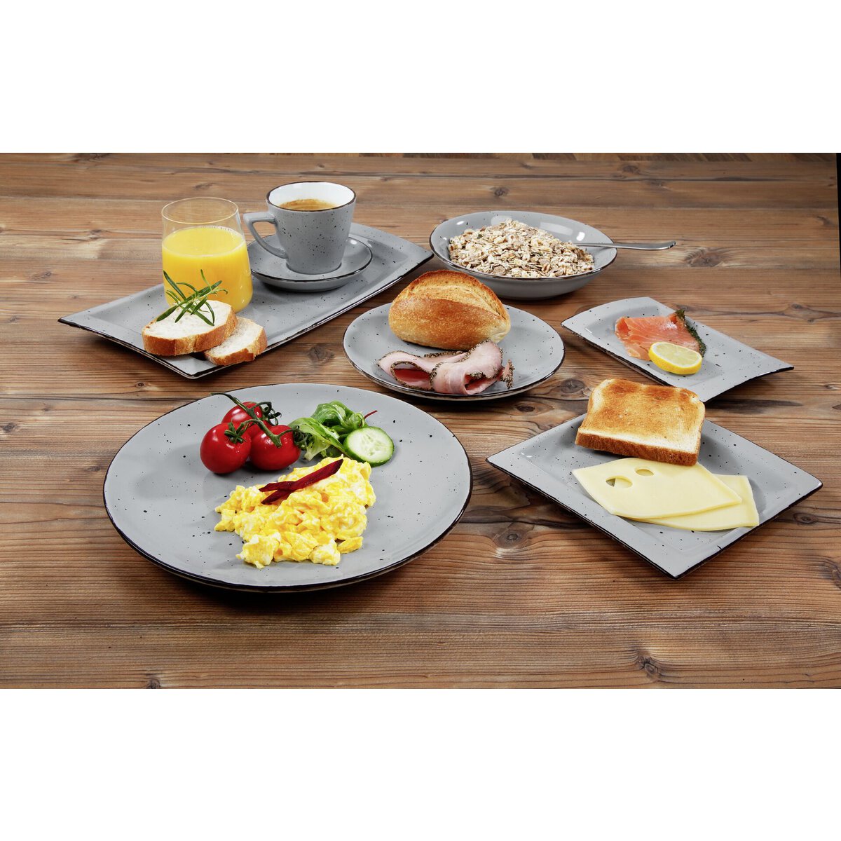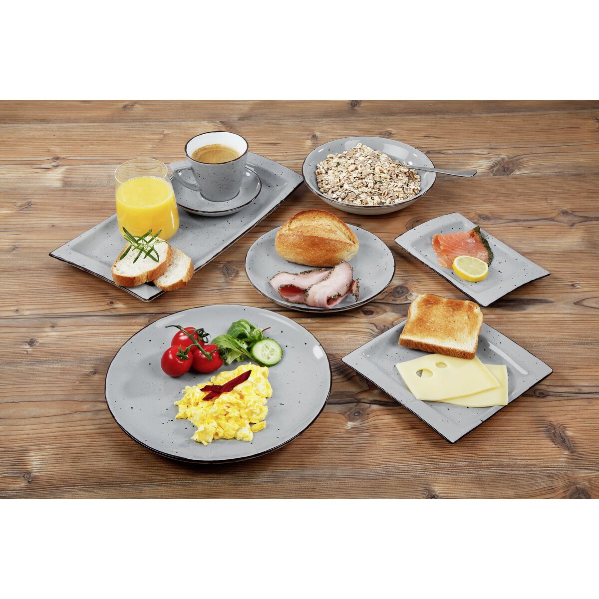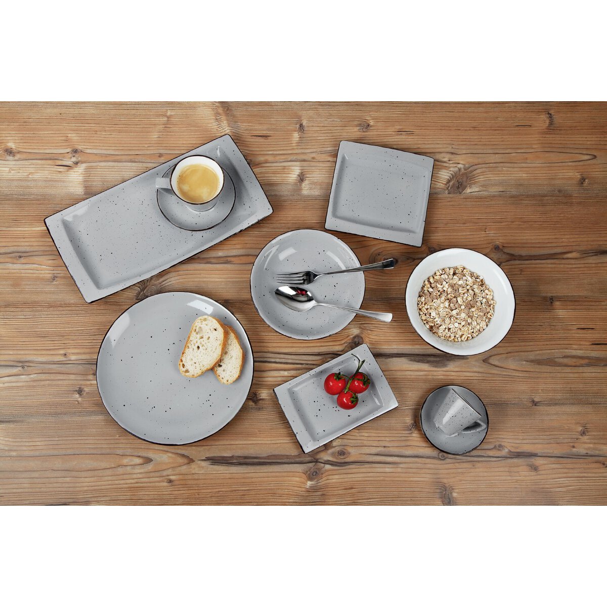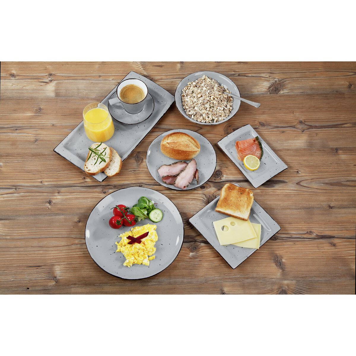 Porzellan. Grundfarbe grau (Farbverlauf bewusst unregelmäßig), Rand braun und Spiegel braun gesprenkelt. Mischsortierung. Spülmaschinengeeignet.