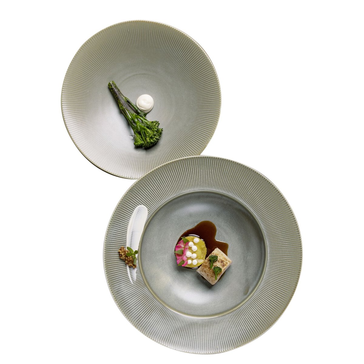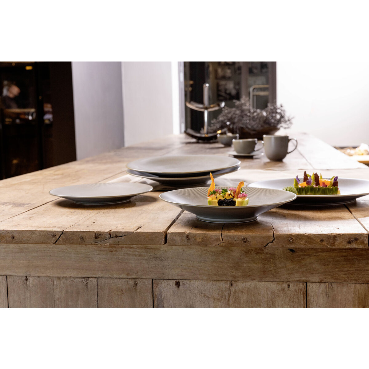Porzellan. Farbe grün/grau. Diese Serie besticht durch klassische Formen und einen modernen Farbverlauf von grün bis grau und erzeugt so einen hochwertigen Retrolook. Dieser Look wird abgerundet durch angedeutete braune, feine Streifen am Rand der Serie. Jedes Teil ein Unikat (Farbverlauf unregelmäßig). Mischsortierung. Spülmaschinengeeignet.