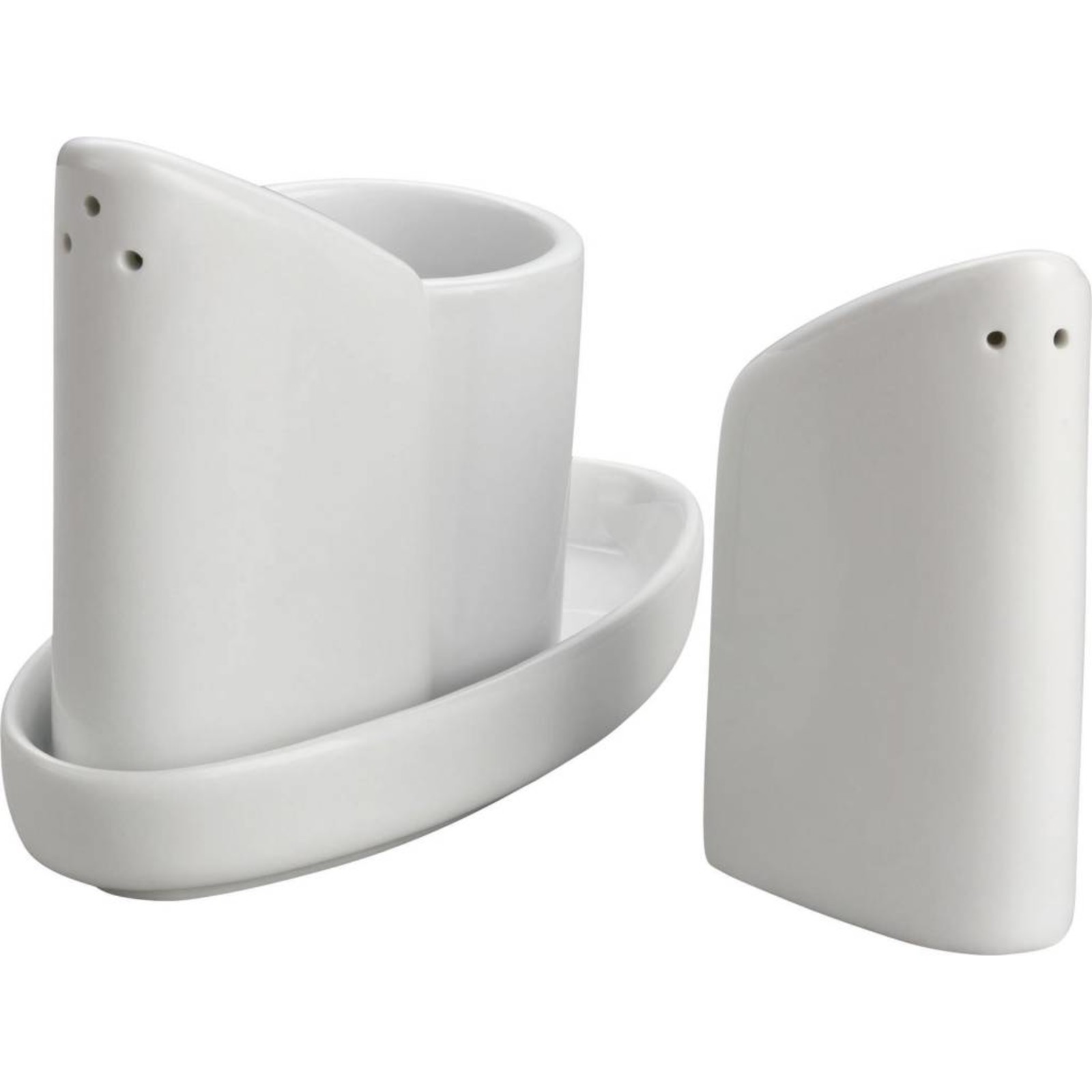 4tlg., Porzellan, weiß. Mit Extrabox für Zahnstocher. Bohrung 1x3 Löcher und 1x2 Löcher für Salz oder Pfeffer. Spülmaschinengeeignet.