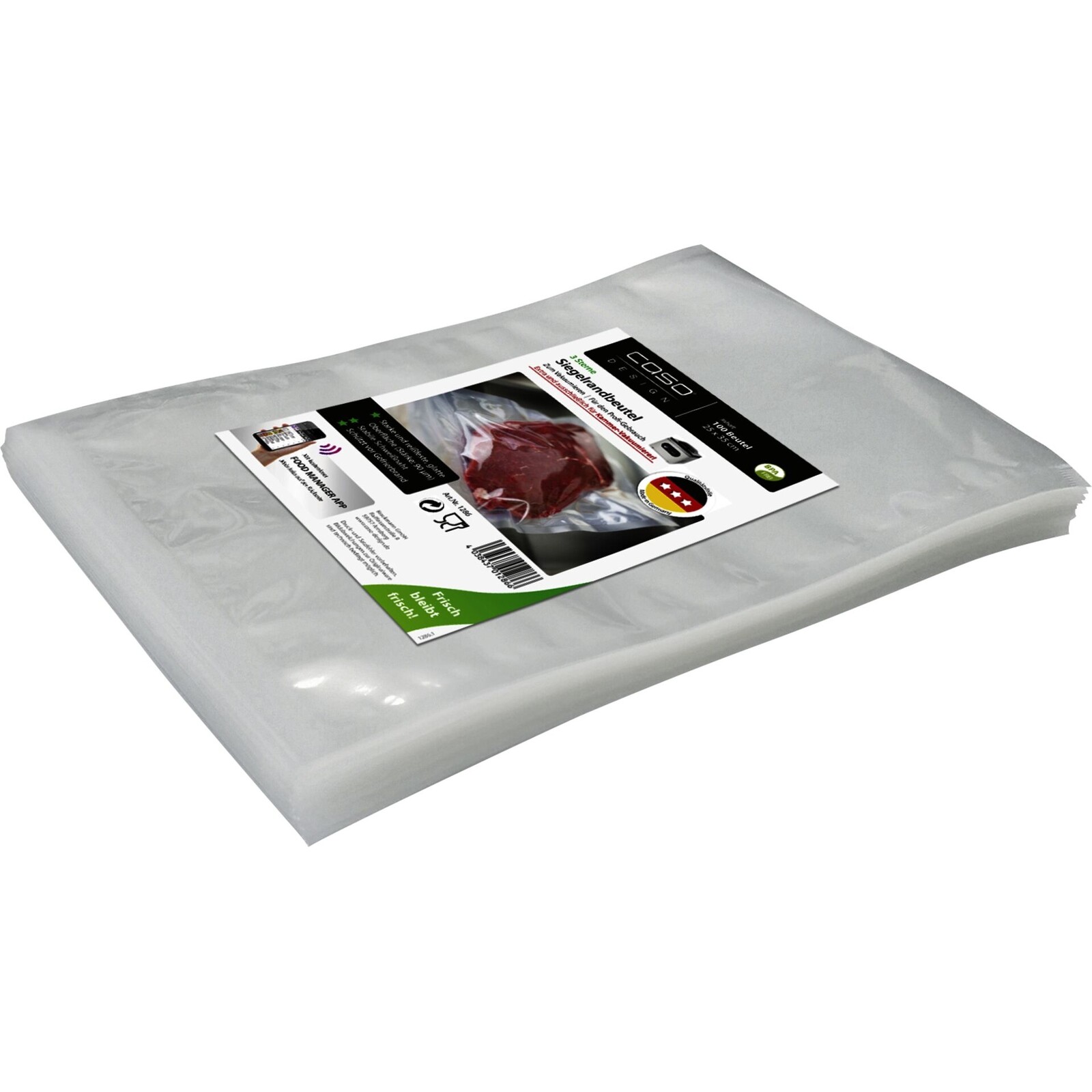 BPA-frei, Sous-Vide geeignet (kochfest bis 70°C für max. 2 Std. oder 100°C für max. 15 min.), schützt vor Gefrierbrand, glatte Oberfläche, nicht für Balkenvakuumierer geeignet. Passend für Artikel 17473 u. 17961.