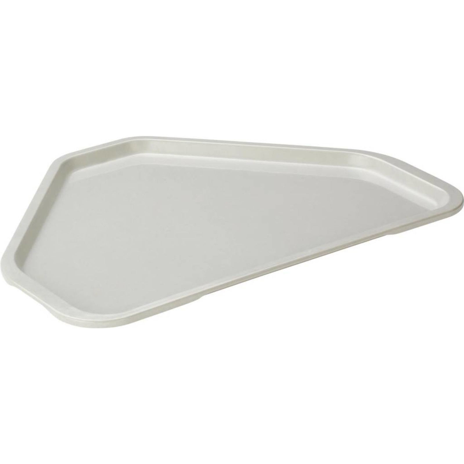Trapezförmiges Polyestertablett, fiberglasverstärkt, lichtgrau. Temperaturbeständig von -50° C bis +140° C. Spülmaschinengeeignet. Desinfizierbar. Mit Rand- und Eckenverstärkung. Mit Stapelnocken. Für Tische 80x80 cm.