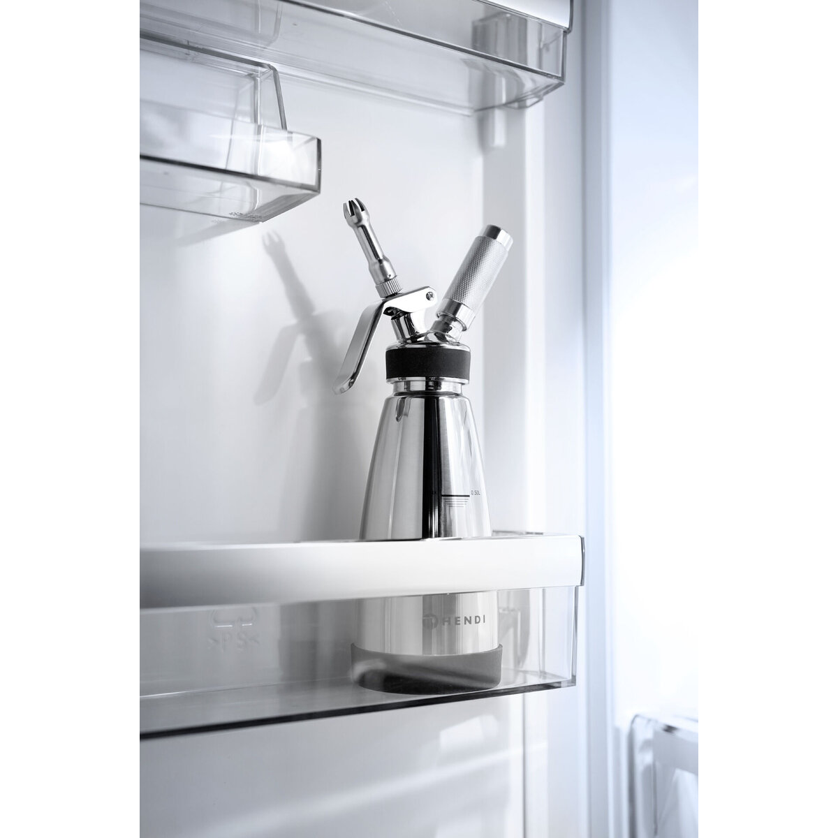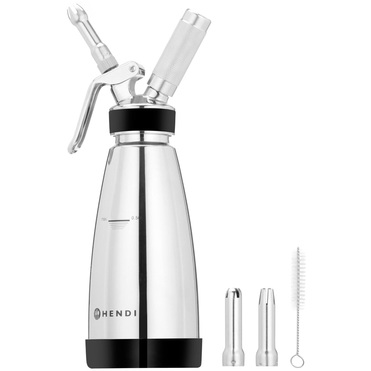 Aus doppelwandigem Edelstahl. Rutschfester Basisring aus Silikon. Siphon eignet sich sowohl für heiße als auch für kalte Saucen. Enthält 3 verschiedene Edelstahldüsen, eine Gaskappe und eine Reinigungsbürste. Für Geschirrspüler geeignet.