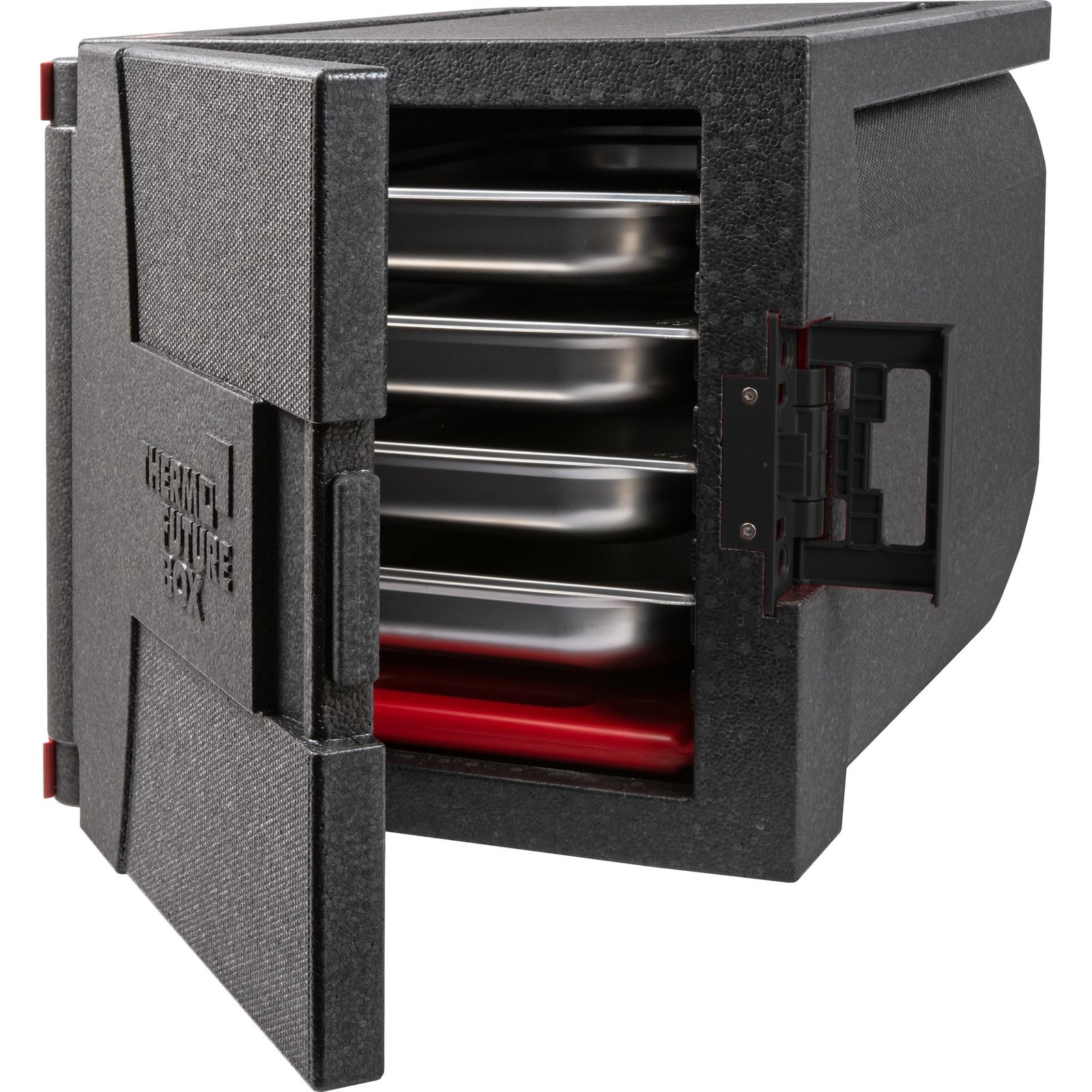 Frontloader. 1/1 GN. Material EPP. Einsatzbereich von -40° bis +120° C. Innenmaß: 53 x 33,5 x 39 cm. 9 Einschubrillen im Abstand von je 3,8 cm. Handliche Griffleisten, scharnierte Tür abnehmbar, kompakte Form, stabil aus einem Stück, praktischer und robuster Griff in schwarz, leicht und stapelbar.