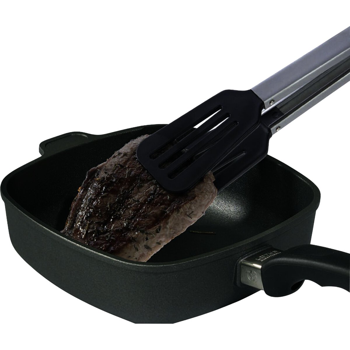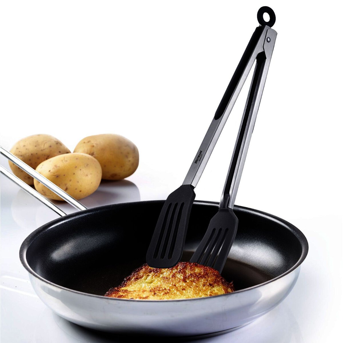 Edelstahl, TPE, Silikon. Hitzebeständig bis 200°C. Mit Feststellmechanismus und Aufhängeöse. Mit breiten Laffen aus Silikon für größeres Bratgut. Ideal für Töpfe und Pfannen mit Antihaftbeschichtung. Spülmaschinengeeignet.
