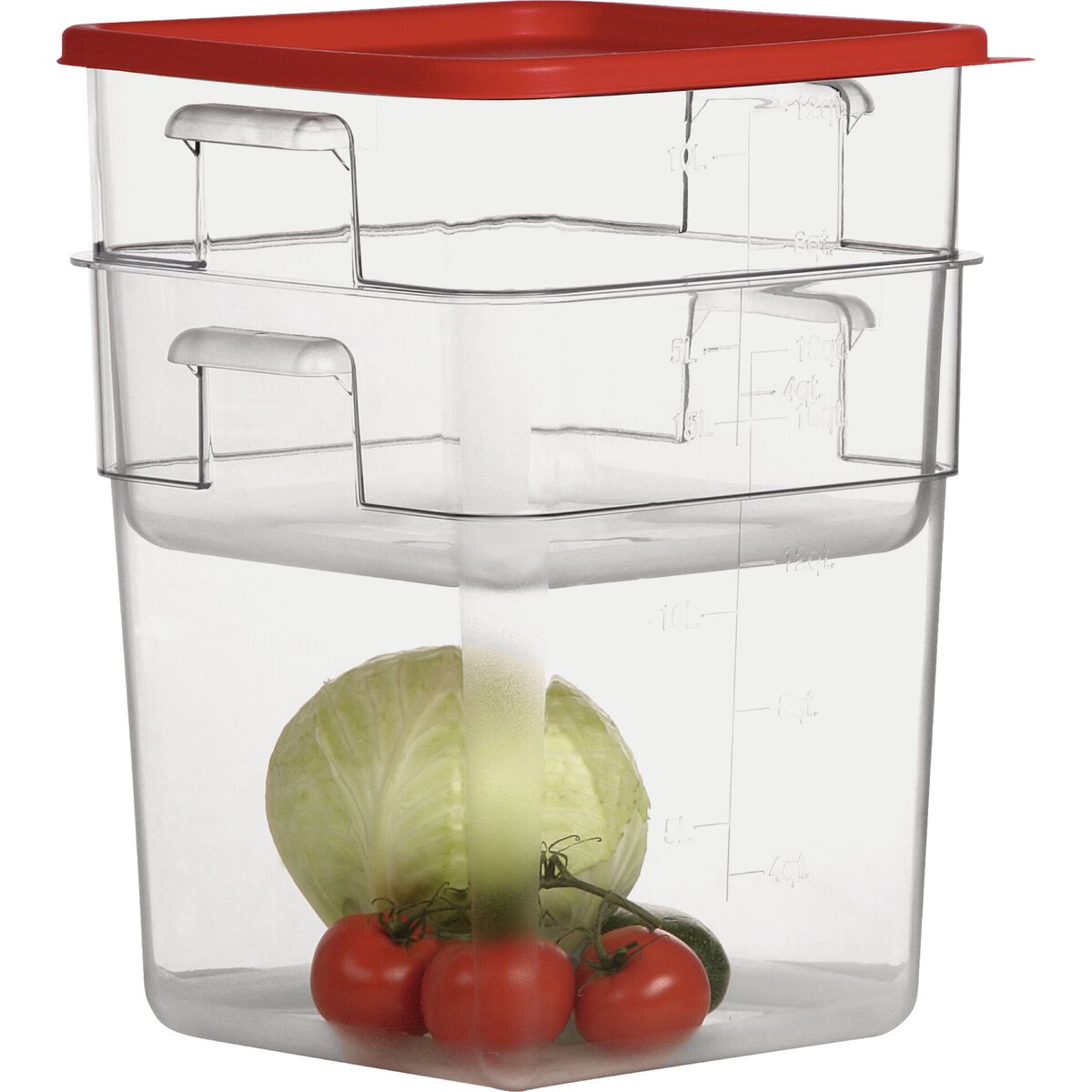 Polycarbonat mit seitlichen Griffen und Skala. Stapelbar. Passenden Deckel bitte separat bestellen.