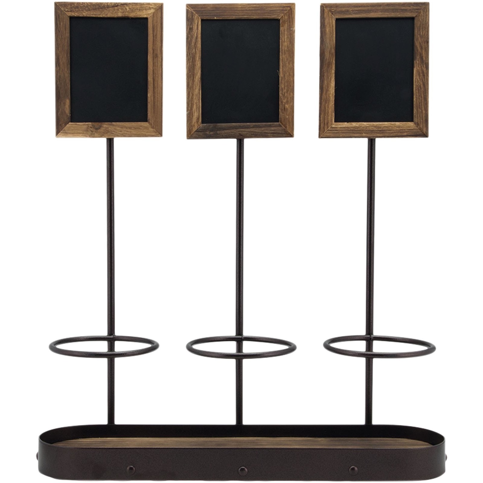 Weinflaschenhalter. Farbe Braun. Beschichtetes Flaschen-Display aus Metall. Über jeder Flasche ist eine kleine, schmutz- und kratzresistente, einfach zu reinigende Kreidetafel mit Holzrahmen (passende Kreidemarker finden Sie im Kapitel "Tafeln").
